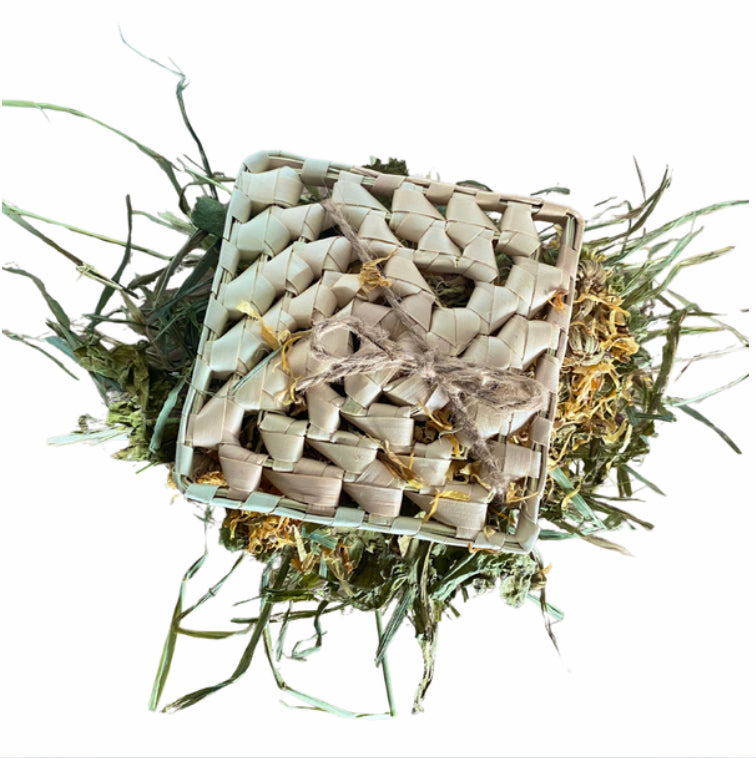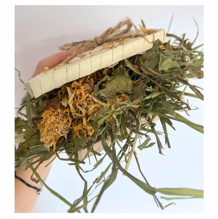 The cosy season is finally here! Our grilled toastie is perfect for snuggling down with! Two palm leaf squares sandwich a delicious mix of soft hay, apple leaves, dandelion leaves, plantain leaves, nettle leaves and marigold flowers.
