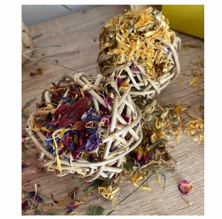 Va va boom with our fabulous vine ball booms, the perfect throw, toss and chew toy for your little floofs! Available stuffed with marigold only or a mix of flowers (which includes rose petals, blue and pink cornflowers, blue mallow flowers, hibiscus and marigold), they’re sure to be a hit!